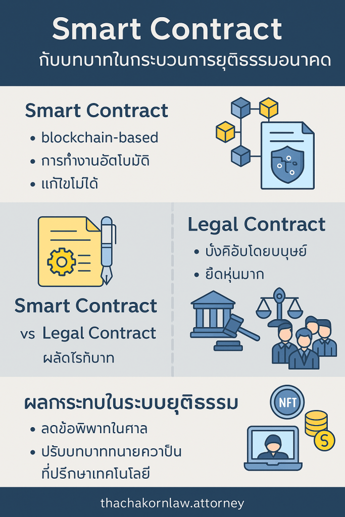 ในยุคที่เทคโนโลยีดิจิทัลและระบบบล็อกเชนมีความก้าวหน้าอย่างรวดเร็ว แนวคิดของ “Smart Contract” หรือ “สัญญาอัจฉริยะ” เริ่มมีบทบาทสำคัญในการพลิกโฉมวงการกฎหมายและกระบวนการยุติธรรมอย่างมีนัยสำคัญ