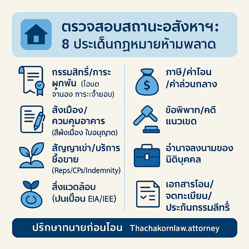 ตรวจสอบสถานะอสังหาฯ ให้มั่นใจก่อนโอน: 8 ประเด็นกฎหมายที่ห้ามพลาด 🏡⚖️